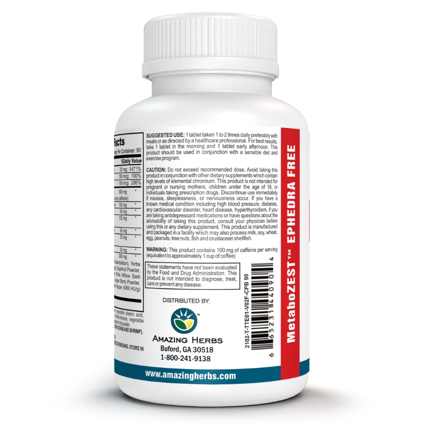MetaboZest is a potent product from Amazing Herbs that focuses on supporting your metabolism to encourage weight loss and improve energy levels. Our weight loss tablet formulation is based on scientifically approved, thermogenic ingredients designed for inactive and overweight individuals.