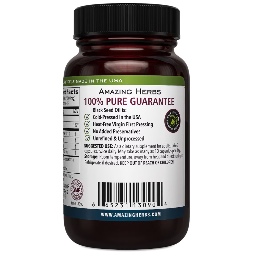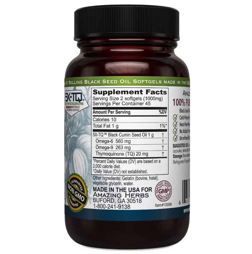 We use only high-grade Nigella sativa seeds to ensure the best black seed oil capsules. This premium quality allows you to reap the benefits of black seed oil and improve your health. Amazing Herbs Black Seed Oil Softgels can support cardiovascular function, promote healthy joints, aid the immune system, and much more!