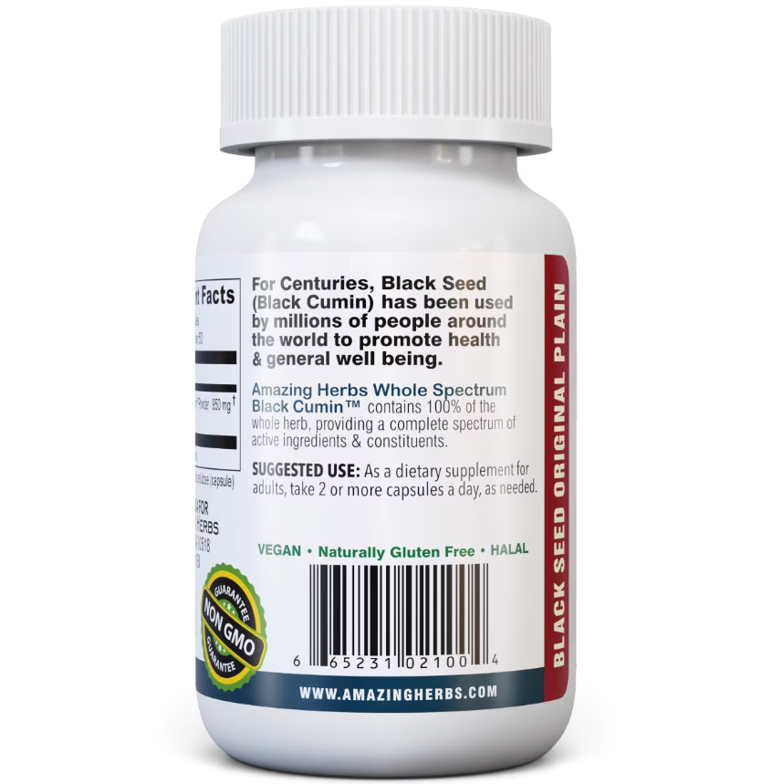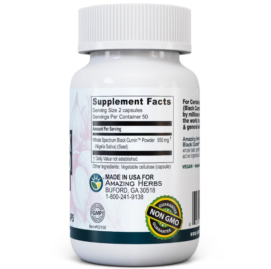 The Whole Spectrum™ Black Cumin Seed formulation does not cause any side effects when taking the recommended dosage. However, in the case of an adverse event, immediately stop usage and contact your physician. Do not take it concurrently with other medications.